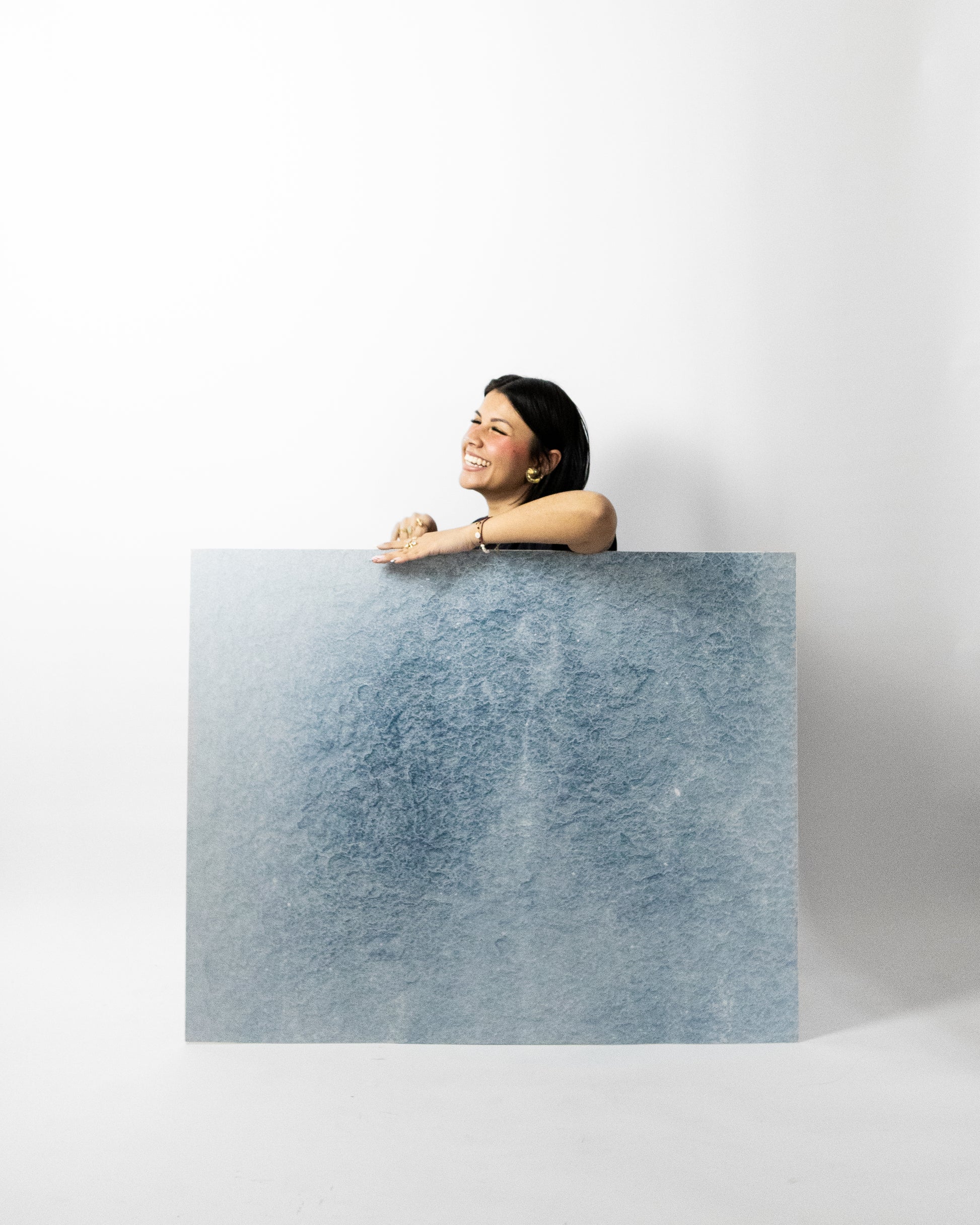 Présentée en grand format sur panneau rigide, la photographie déploie une dimension immersive : l’échelle amplifie les détails, enveloppe le regard et invite le spectateur à entrer dans la matière. L’œuvre impose ainsi une présence physique et contemplative, comme une immersion silencieuse dans un horizon bleu.