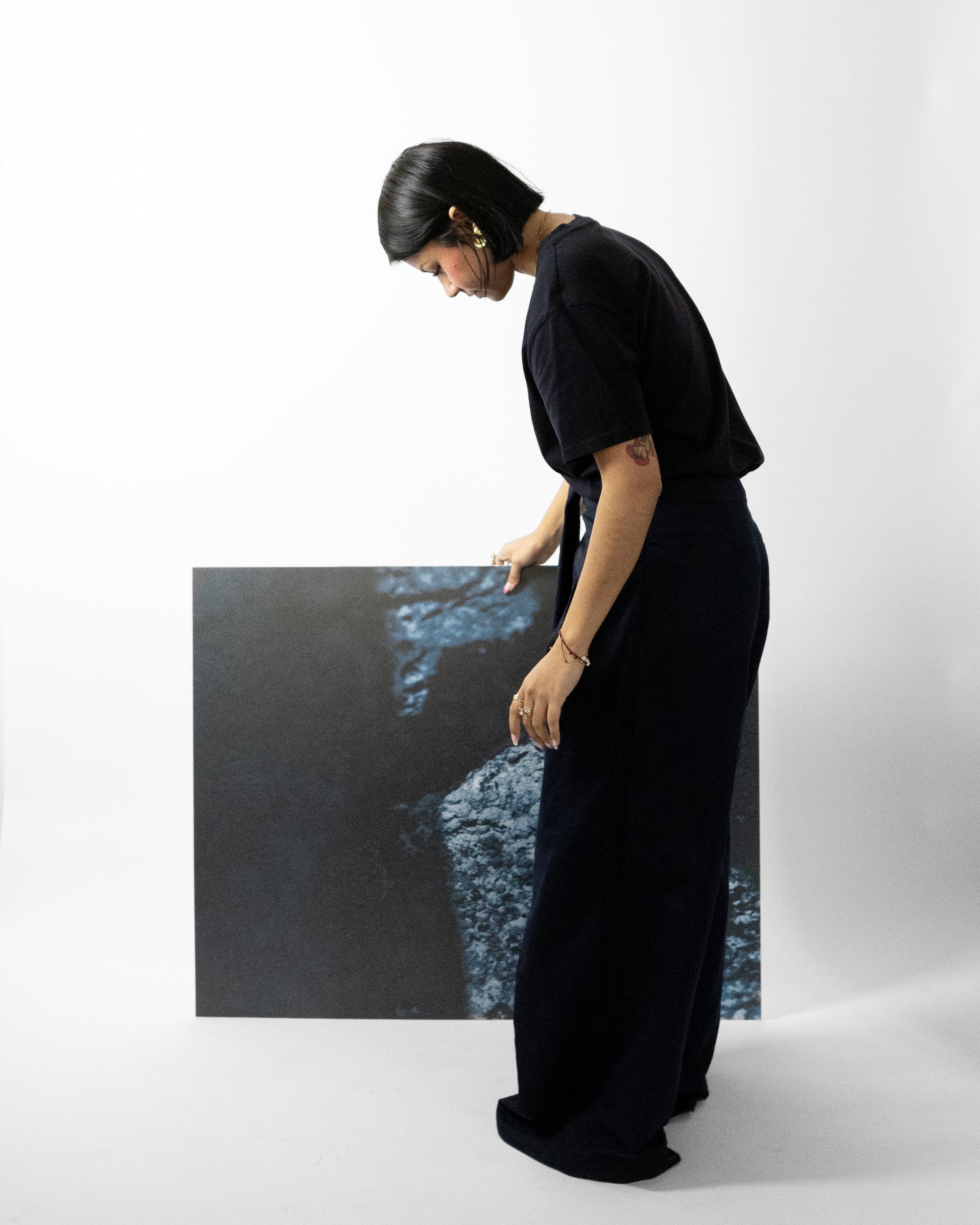 Présentée en grand format sur panneau rigide, la photographie déploie une dimension immersive : l’échelle amplifie les détails, enveloppe le regard et invite le spectateur à entrer dans la matière. L’œuvre impose ainsi une présence physique et contemplative, comme une immersion silencieuse dans un horizon bleu.